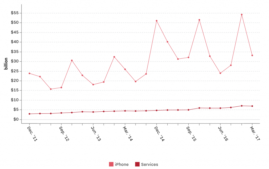3 – Tutarlı bir büyüme gösteriyor. Belki de hizmetlerin en çekici unsurlarından birisi bu. iPhone’dan elde edilen gelirler dönemsel olarak azalıp artarken hizmetlerden elde edilen gelirlerde 2011’den bu yana düzenli bir artış görülüyor.