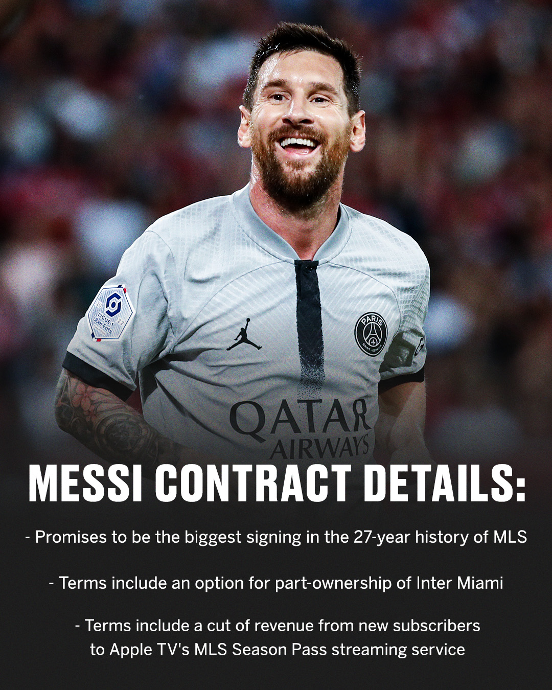 Futbol süperstarı Lionel Messi, bugün MLS kulübü Inter Miami’ye katılmayı amaçladığını açıkladı. ESPN’e göre, Messi’nin önerilen sözleşme şartları, Apple’ın MLS Sezon Geçişi yayın hizmetine yeni abonelerden gelen gelirden pay almayı içeriyor.