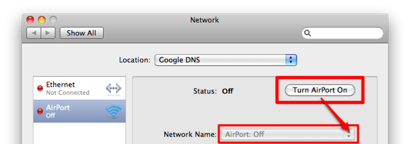 Öncelikle System Preferences altından Network ayarlarına giriyoruz. Burada Mac’imizin AirPort adlı kablosuz ağ sağlayıcısı kapalı ise “Turn AirPort On” butonuna tıklayarak açık hale getiriyoruz.