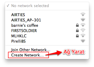 OK tuşuna bastığımız zaman kablosuz ağımızı Mac’imiz aracılığıyla yaratmış oluyoruz ve menü çubuğunda aşağıdaki gibi bir ikon görüyoruz.