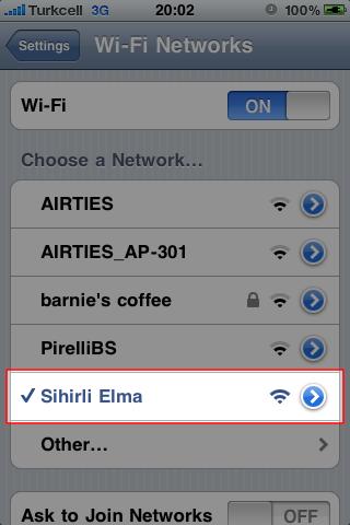 Sıra yarattığımız bu kablosuz ağımıza iPhone’umuzdan bağlanmaya geldi. iPhone’umuzdan “Ayarlar -> Kablosuz Ağ” (Settings -> Wi-Fi) ayarları içerisinden kablosuz ağı aktif hale getiriyoruz. Bu aşamadan sonra aşağıda çıkan listede yarattığımız kablosuz ağımızı görebiliyor olmamız gerekiyor.