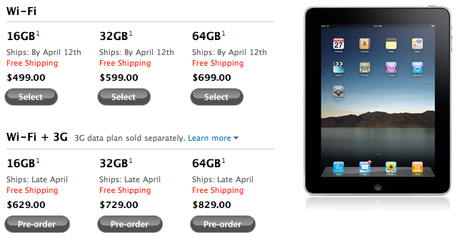 Son olarak, henüz Türkiye için satış tarihi ve fiyatlar konusunda bir gelişme olmasa da, iPad’in ABD için açıklanan satış fiyatlarını hatırlatalım. iPad’in 2 farklı modeli bulunuyor: Sadece WiFi destekleyen ve WiFi + 3G destekleyen model. Şu anda sadece WiFi destekli modelin satışı gerçekleşiyor, ancak Nisan sonunda WiFi + 3G destekleyen cihaz da piyasada olacak. Bu iki model de 3 farklı kapasite ile piyasada olacak: 16GB, 32GB ve 64GB. Bu modellerin listesini ve ABD için fiyatlarını aşağıda bulabilirsiniz.