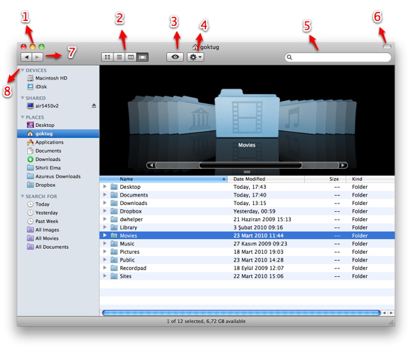 Üzerine tıkladığımızda açık olan Finder penceresi karşımıza gelir, eğer hiçbir pencere açık değilse yeni bir Finder penceresi açılır. Aşağıda örnek bir Finder penceresini ve bu penceredeki bazı temel özellikleri bulabilirsiniz…