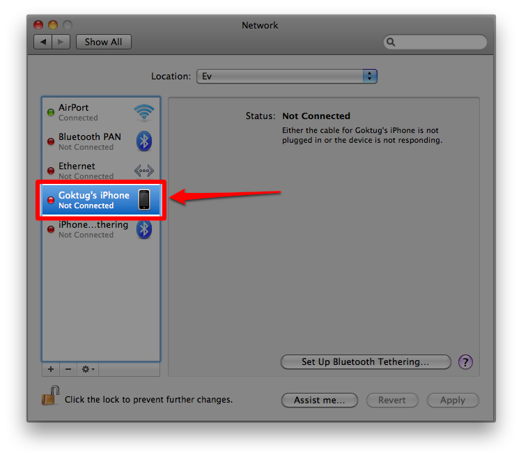 Artık iPhone’umuzu sol taraftaki listede görebiliyor olmamız gerekiyor. Bu aşamadan sonra artık yarattığımız “Ev” konumu aktifken iPhone’umuz ile de internete bağlanabiliriz. iPhone’umuz ile internete nasıl bağlanılacağı ile ilgili olarak iPhoneTurkey.biz adresindeki şu yazıya göz atabilirsiniz. iPhone’umuz üzerinden hem kablo hem de Bluetooth ile nasıl internete bağlanabileceğimize ilerideki yazılarımızda değineceğiz.