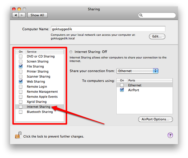 Açılan pencerede sol tarafta Mac’imizdeki paylaşım servislerinin listesini ve işaretli kutucuklar sayesinde de hangi paylaşım servislerinin aktif olduğunu görebiliriz. Kablosuz ağımıza internet paylaşımını aktif hale getirmek için listede aşağılarda yer alan “Internet Sharing” in üzerinde tıklıyoruz. Burada kutucuğa değil, sadece “Internet Sharing” yazısına tıklamamız gerekiyor. Çünkü “Internet Sharing” aktif haldeyken ayarlarımızı değiştiremiyoruz.