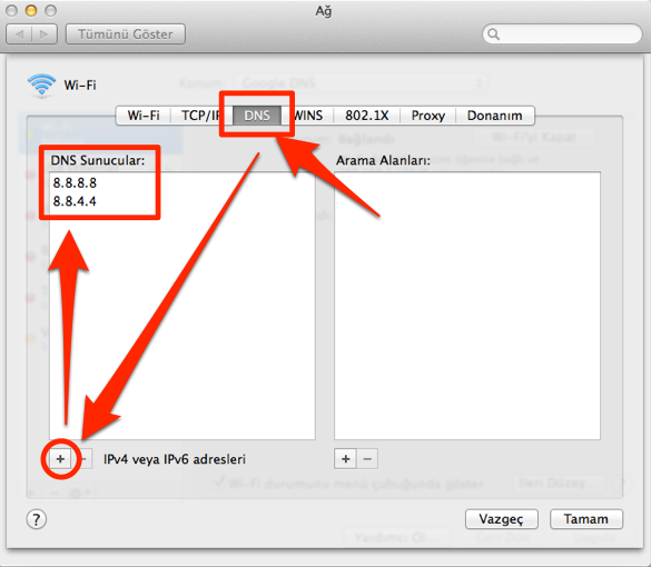 Açılan yeni pencerede üst kısımdan DNS sekmesine tıklıyoruz. Burada gördüğümüz kutulardan, soldakinin içerisinde bazı rakamlar var ise aşağıdaki eksi (-) işaretine tıklayarak bunları temizliyoruz. Kutular temizlendikten sonra artı (+) işaretine tıklıyoruz ve resimde görülen yere “8.8.8.8” yazıyoruz. Bir kez daha artı (+) işaretine tıklıyoruz, ve bu sefer de “8.8.4.4” yazıyor ve enter / return tuşuna basıyoruz. “OK” butonuna tıklayarak penceremizi kapatıyoruz.