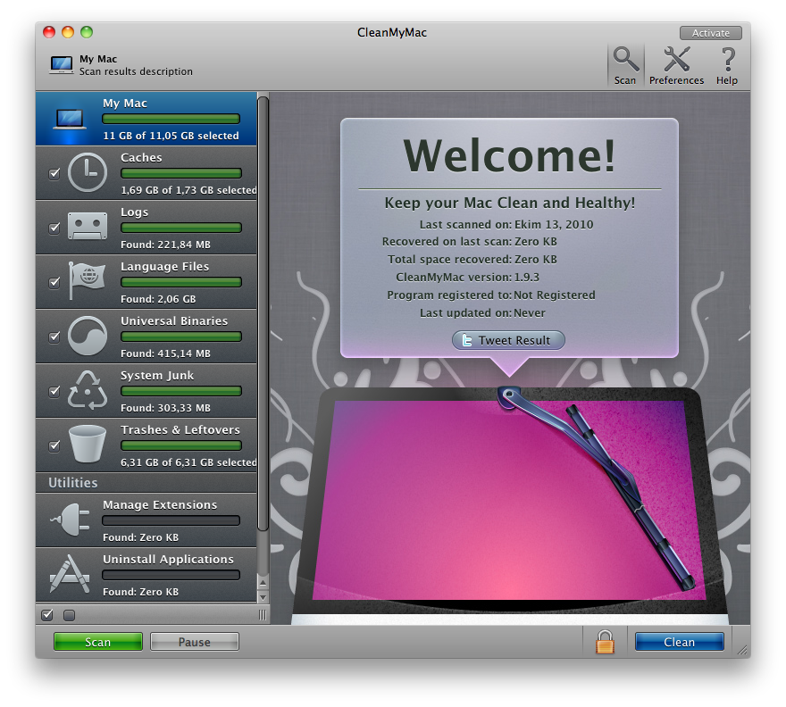 CleanMyMac, sistemimi birkaç dakika içerisinde taradı, yaklaşık 11 GB’lık temizlik yapabileceğini söyledi. Temizle tuşuna bastıktan 5 dakika sonra da Mac’imde 11 GB’lık yer açıldı, sorunsuz, sıkıntısız… 🙂