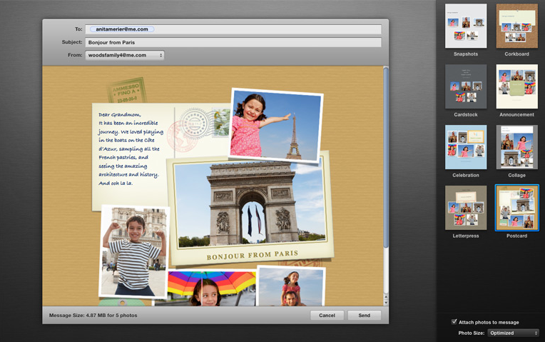 Bir diğer yenilik ise eposta gönderirken karşımıza çıkıyor. Artık sıradan bir şekilde sadece resimleri ekleyip posta göndermektense, gönderdiğimiz epostanın daha şık ve göze hoş görünmesini sağlayabiliyoruz. Bir diğer önemli detay da, artık epostaların iPhoto uygulaması içerisinden gönderilebilmesi, yani Mail uygulamasına bağımlı değiliz.. 🙂