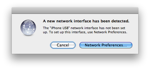iPhone’umuzdaki interneti Mac’imiz ile paylaştırmak oldukça kolay. İlk yapmamız gereken şey iPhone’umuzu kablo ile Mac’imize bağlamak. Eğer daha önce yapmadıysak iPhone’umuzu bağladığımızda karşımıza aşağıdaki gibi bir pencere çıkacaktır. Bu pencere bize iPhone’umuzu bir ağ arayüzü olarak kullanmak için gerekli ayarları yapmamızı söylüyor. “Network Preferences” butonuna basarak ilerleyebiliriz.
