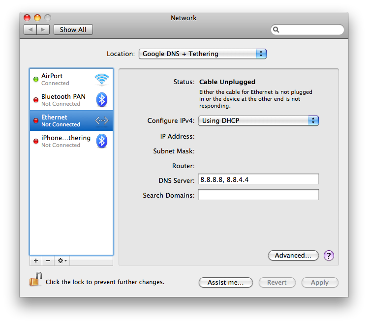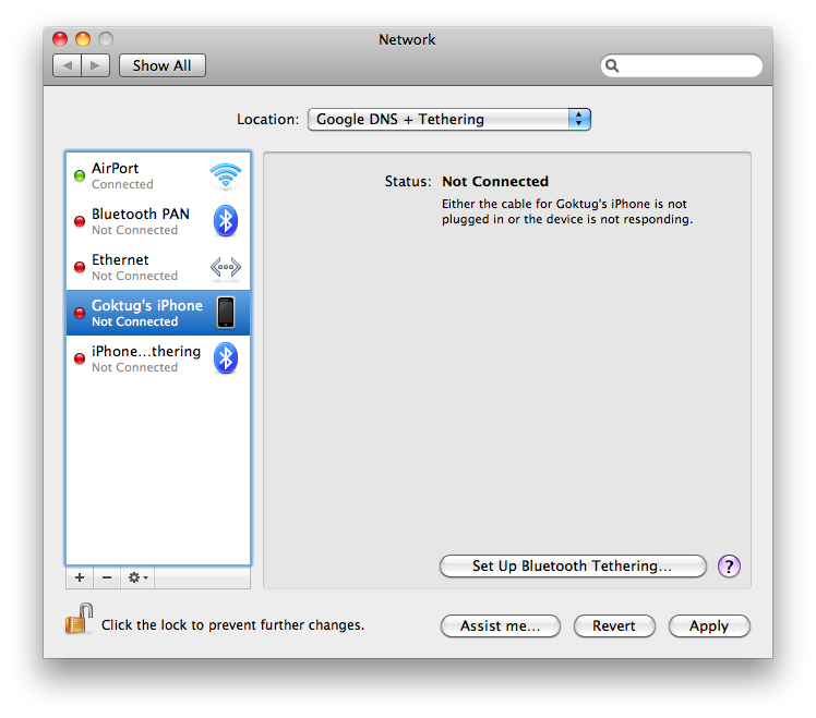 Daha iyi anlatmak gerekirse, evden her zaman bağlandığımız şekilde internete bağlanırken, iPhone’umuzu Mac’imize bağladığımızda birden bire tüm internet bağlantımızın iPhone üzerinden geçmesini pek istemeyiz. Bunun yerine “Google DNS Tethering” adlı bir konum (Location) yaratırsak, iPhone’umuzdan internete çıkmak istediğimiz zaman bu konumu seçmemiz yeterli olacaktır. (Evdeyken kablosuz ağ ile bağlanırken bir konum, dışarda iPhone üzerinden internete bağlanırken diğer konum)
