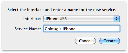 Yeni konumumuzu oluşturduktan sonra sol taraftaki kısımda iPhone ile ilgili bir satır yaratmak, yani iPhone’umuz üzerinden internete çıkabilmek için aşağıdaki artı (+) butonuna tıklıyoruz. Açılan pencere içerisinden üst kısımdan “iPhone USB”yi seçiyoruz ve altındaki kutuya bir isim giriyoruz (Örnek: Goktug’un iPhone’u) ve Create (Yarat) butonuna tıklıyoruz.