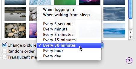 Mac’imizi her açtığımızda, Mac’imiz uyku modundan çıktığında, 5 saniyede bir, her saatte ya da her gün masaüstü resmimizin değişmesini seçebiliyoruz. Hemen altındaki ‘Random Order’ butonu seçtiğimiz taktirde de resimlerimiz rastgele bir sırada görüntüleniyor.