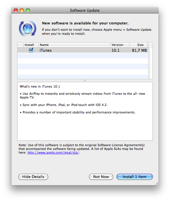 Hala farketmeyenler için hatırlatalım; Apple, geçtiğimiz akşam iTunes’un 10.1 sürümünü yayınladı. 81,2 MB’lık bu güncelleme paketiyle AppleTV’ye anında video stream etmek için gerekli olan AirPlay desteği, iOS cihazları için 4.2 güncellemesi için gereken hazırlıklar ve birçok stabilite ve performans geliştirmeleri birlikte geliyor.