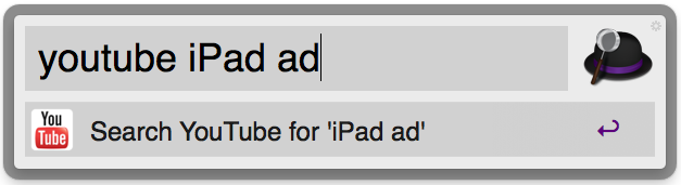 Peki Google’da değil de Wikipedia, YouTube, IMDb ya da Google Images gibi daha özel sonuçlara ulaşabileceğimiz sitelerde arama yapmak istiyorsak…? Alfred bize bu konuda da yardımcı oluyor. “wiki apple” yazarak Wikipedia’da Apple’ı ya da “youtube iPad ad” yazarak YouTube’da “iPad ad”i aratabiliyoruz.