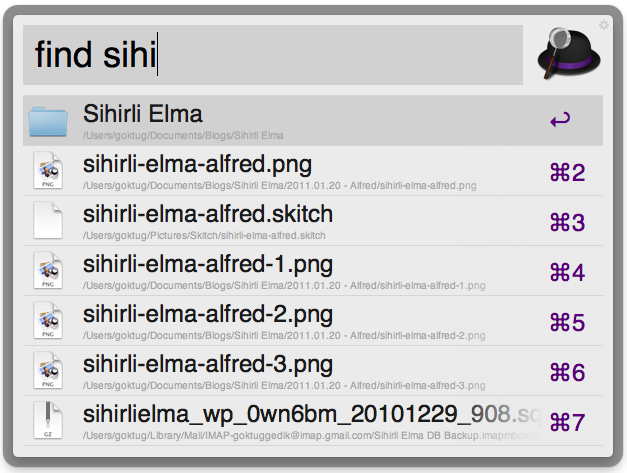 Hemen aşağıya açılan, Alfred’in bize sunduğu tercihler arasından çok yüksek ihtimalle aradığımız şey en üstte yer alıyor. En üsttekini seçmek için “enter / return” tuşuna basıyoruz. Eğer ulaşmak istediğimiz sonuç diğerleriyse fareyi kullanarak seçebiliyoruz ya da hemen yanındaki kısayolu kullanabiliyoruz. Command-1,command-2 vb… şeklinde gidiyor…
