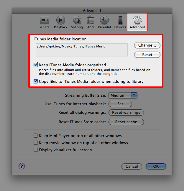 Kütüphanelerimizi oluşturmadan, yani müzik arşivimizi iTunes ile yönetmeden önce ufak ama önemli bir ayarı kontrol etmemiz gerekiyor. iTunes – Preferences (Tercihler) içerisindeki “Advanced” sekmesi altında yer alan 3 tane önemli ayar söz konusu: