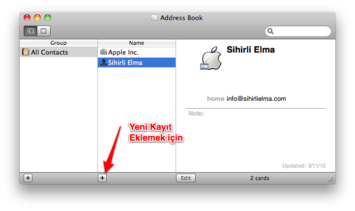 Eğer daha önce bir kayıt eklemediysek, Adres Defteri’ni ilk açtığımızda Apple’ın kendisi için oluşturduğu örnek kaydı ve kendi hesabımızın kaydını görüyoruz.Yeni bir kayıt eklemek için “File” menüsünden “New Card“ı seçiyor ya da “Name” kolonunun altındaki artı işaretine tıklıyoruz.