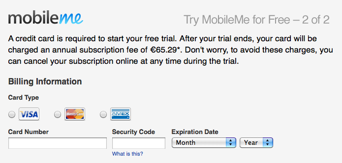 Denemesi bedava! 🙂 MobileMe’yi 60 gün boyunca, tamamen ücretsiz bir şekilde kullanabiliyoruz. Ancak 60 gün sonrasında üyeliğimizi iptal etmezsek, otomatik olarak kredi kartımızdan 1 yıllık üyelik bedeli tahsil ediliyor. Bu yüzden eğer deneme hesabı açtıysak, 59.gün için takvimimize bir hatırlatma koymakta fayda var 😉