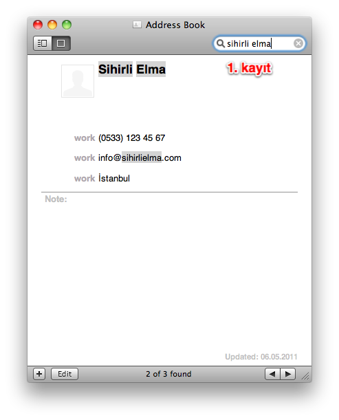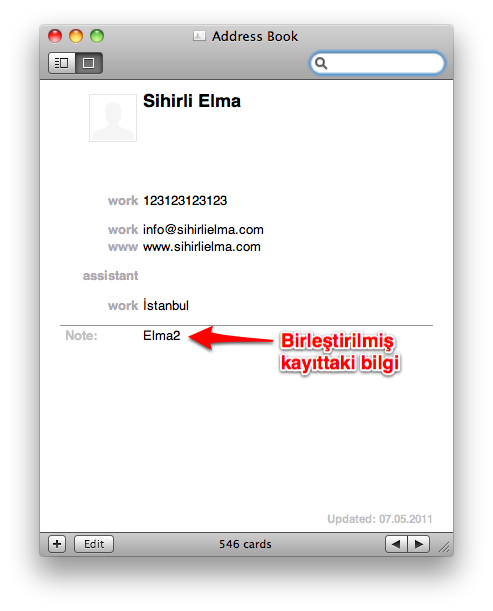 Örnek olması açısından adres defterimde 2 tane “Sihirli Elma” diye kayıt yarattım. İçeriği farklı olan bu iki kaydı Adres Defteri sayesinde kolayca birleştirebiliyoruz.