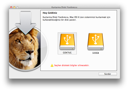 Lion Kurtarma Diski Yardımcısı penceresine yeniden dönüyoruz. Kullanmak istediğimiz diski seçiyor ve “Sürdür” butonuna tıklıyoruz.
