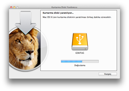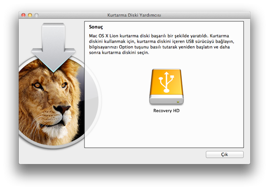 NOT: Lion Kurtarma Diski Yardımcısı bittiği zaman, yeni oluşturduğumuz bölüntüyü (partition) ne Finder içerisinden ne de Disk İzlencesi içerisinden göremiyoruz. Kullanmak için yukarıda bahsettiğimiz şekilde, bu disk Mac’imize bağlıyken, Mac’imizi “alt / option” tuşuna basarak açmamız gerekiyor.