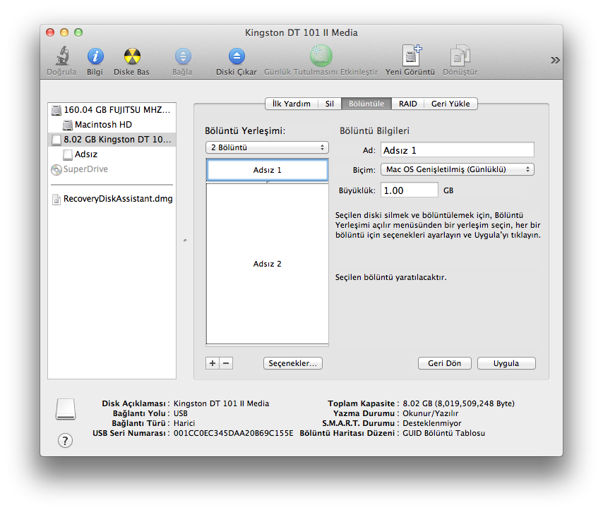 - Biçim kısmından ise “Mac OS Genişletilmiş (Günlüklü)” işaretliyoruz.