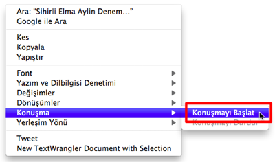 Örneğin Safari’de bir web sitesindeki metinleri Aylin’e okutmak için yapmamız gereken tek şey, okunacak metni seçili hale getirmek ve sağ tıklayarak Konuşma -> “Konuşmayı Başlat”ı seçmek.