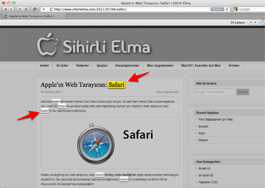 Safari’de bir sayfada arama yapmak çok keyifli! Ne demek istediğimi bu özelliği kullanarak anlayabilirsiniz 🙂 command-F kısayolunu kullandıktan sonra aramak istediğimiz kelimeyi yazıyoruz. Ve daha biz yazarken sayfada bu kelimeler belirmeye başlıyor bile! 🙂
