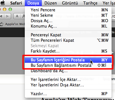 Safari’de en sevdiğim özelliklerden birisini paylaşmadan geçemezdim elbette… 🙂 Diyelim ki Sihirli Elma’daki bu yazıyı beğendiniz ve bir arkadaşınıza e-posta olarak göndermek istiyorsunuz. Dosya menüsündeki iki seçenek bize yardımcı oluyor: