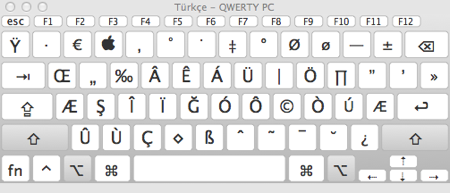 Örneğin alt (option) tuşuna basılı tuttuğumuzda şöyle bir klavye düzeni görüyoruz.
