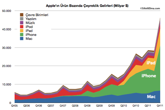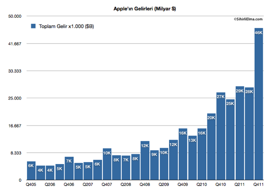 Neredeyse aynı şeyleri yazıp duruyorum kaç çeyrektir. 🙂 Apple büyümesini, satışlarını ve kârını katlanarak arttırıyor, yapacak bir şey yok. Yazmaya devam… Apple dün akşam açıkladığı sonuçlar ile 2011’in Ekim-Kasım-Aralık dönemi itibariyle gelmiş geçmiş en iyi çeyrek sonuçlarını paylaşmış oldu. iPhone 4S’i başarısız ya da yetersiz bulanların, ya da “tutmayacağını” tahmin etmiş olanların sonuçlara detaylıca bakmasını öneriyorum… 🙂