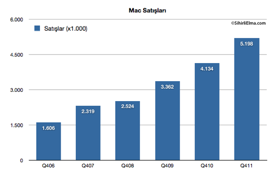 - Bir çeyrekte satılan Mac sayısı ilk defa 5 milyonu geçti. Hem de aileye yeni bir Mac katılmamasına rağmen! iPhone ve iPad satışları, Mac satışlarını da arttırıyor diyebiliriz bu durumda… 🙂