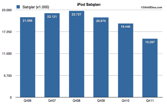 iPod’daki düşüş bir süredir devam ediyor, ve kolay kolay da duracak gibi değil aslında. Zira iPod yavaş yavaş görevini tamamlayıp belli bir satış seviyesine gerileyecek gibi görünüyor. Ancak yine de bu çeyrekte 15 milyondan fazla iPod satılmış.
