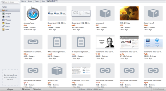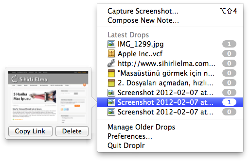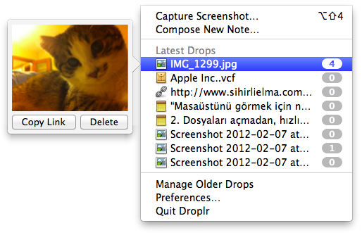 Droplr aynı zamanda paylaştığımız tüm dosyaların da adreslerini saklıyor. Menü çubuğundaki ikona tıklayarak, en son paylaştığımız 8 dosyayı görebiliyor, üzerlerine gelerek önizlemelerine bile göz atabiliyoruz.