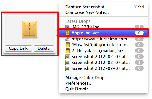 Eklenti desteği sayesinde, bu uygulamalardan herhangi birinin içerisinde, bir dosya seçiliyken alt-D kısayolunu kullanarak bu dosyayı anında Droplr’a gönderebiliyoruz. Örneğin adres defterimizdeki bir kişiyi paylaşmak istiyorsak, bu kişiyi seçip alt-D kısayoluna basıyoruz. Artık Droplr’ın oluşturduğu kısayolu paylaşarak, dosya yüklemeye ya da göndermeye gerek kalmadan sadece web bağlantısını paylaşarak bu kişinin bilgilerini paylaşabiliyoruz.