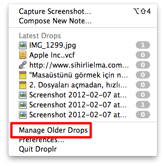 Eğer daha eski paylaşımlarımızın adreslerini bulmak istiyorsak menü çubuğundaki ikona tıkladıktan sonra aşağıdan “Manage Older Drops”u seçmemiz gerekiyor.