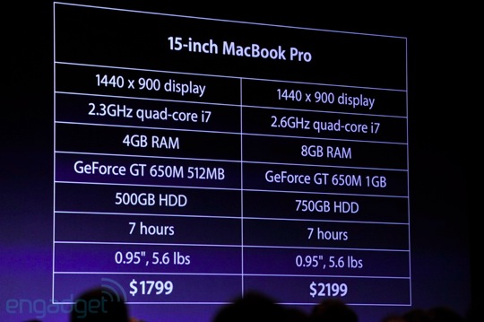 Asıl yeni ve heyecan uyandıran ürün ise “yeni nesil MacBook Pro” olarak tanıtılan “Retina Display’li MacBook Pro”. Bu ürün ile Apple aslında MacBook Pro’yu MacBook Air’e benzeterek biraz da güçlendirmiş.