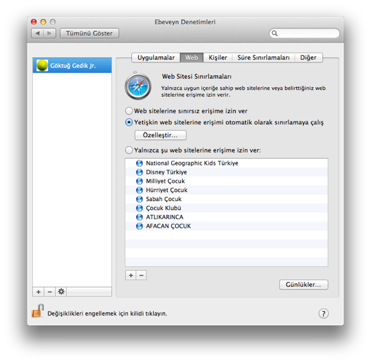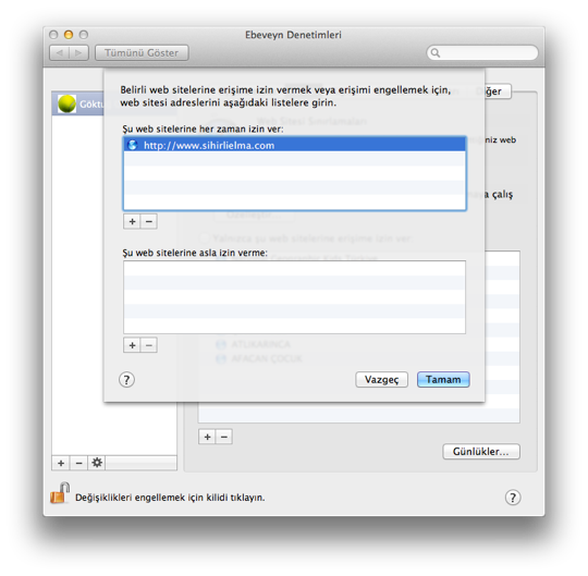 Mail ve iChat kullanımını sınırlandırabildiğimiz bu sekmede, sadece seçili kişilerle iletişime geçilmesine izin verebiliyoruz. Örneğin iChat’te sadece belirli kişilerle sohbet edilebilmesini sağlamak ya da sadece belirli kişilere e-posta gönderilmesine izin vermek mümkün.