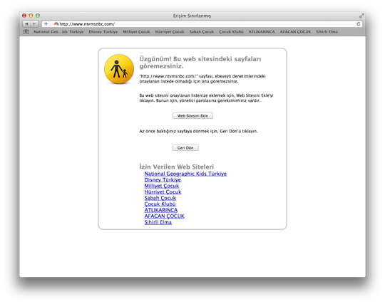 Erişim izni olmayan bir web sitesi ziyaret edilmek istendiğinde ise, erişimin kısıtlandığına dair bir ekranla karşılaşılıyor.