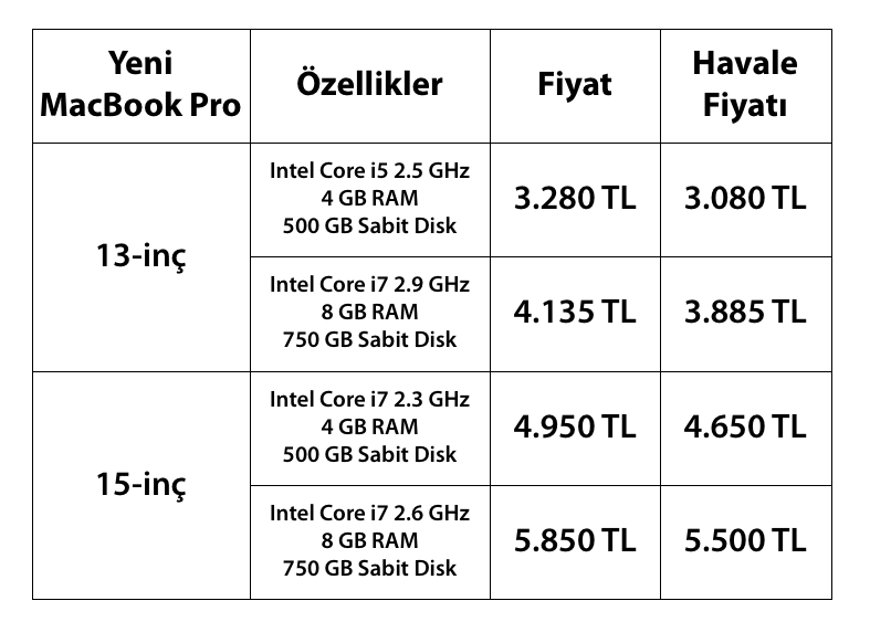 Elbette fazla gecikmeden bu ürünlerin Türkiye’de de satışa sunuluyor olması çok güzel bir gelişme. Ancak fiyatlar hala yüksek ne yazık ki… ABD’den alındığında vergisi ile birlikte yaklaşık 2000 TL’ye satın alınabilen bir MacBook Air, Türkiye’de en düşük 2.600 TL’den başlıyor. Giriş seviyesindeki Retina MacBook Pro’da ise ABD fiyatıyla alındığında 4415 TL’ye geliyorken, Türkiye’de 5500 TL civarında.
