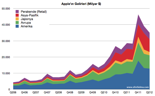 Asya-Pasifik gelirleri %25 artmış ve Çin’in gelirleri bu bölgenin artık 3’te 1‘ini oluşturmaya başlamış. Çin pazarında Apple her geçen çeyrek daha da güçlenmeye başladı diyebiliriz.