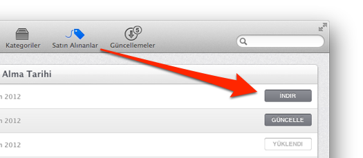 Eğer Mountain Lion kurulumunu tamamladıysak, “Install Mac OS X Mountain Lion” uygulaması kendi kendini siliyor. Ancak ihtiyacımız olduğu için yeniden indirmemiz gerekiyor. Bunun için Mac App Store’u açtıktan sonra, “Satın Alınanlar” sekmesine tıkladığımızda, OS X Mountain Lion’ın yanında “İndir” butonunu görüyor olacağız. 🙂 Bu butona tıklayarak indirmeye başlayabiliriz.