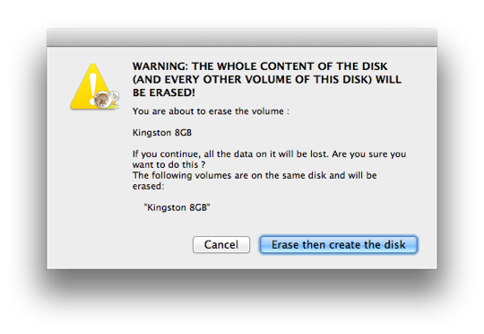 Karşımıza son uyarı çıkıyor. Bu ekranı da geçtikten sonra USB diskimizin içeriği tamemen silineceği için diskin boş olduğundan ya da içerisinde önemli bir veri olmadığından emin olmamız gerekiyor. “Erase then create the disk” butonuna basarak işlemler başlatıyoruz.