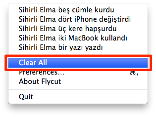 Ve elbette menü çubuğundaki “Clear All”a tıklayarak da Flycut içerisinde kaydettiklerimizi temizleyebiliyoruz… 🙂