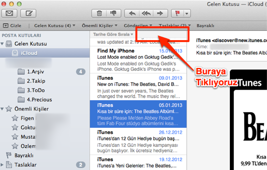 Mail’de maillerimizin listelendiği kısımda “sıralama çubuğuna” tıklayarak listenin en üstüne kolayca çıkabiliyoruz.