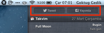 Facebook ve Twitter ayarlarımızı yaptıktan sonra Bildirim Merkezi’nin en üstünde her iki uygulama için de gördüğümüz butonlar yardımıyla bu güncellemeleri yazmak ve göndermek mümkün.
