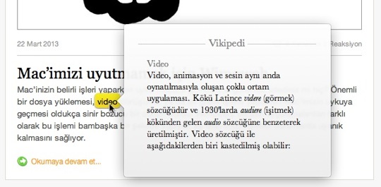 Aynı kısayolu bir metine uyguladığımızda ise sözlük açılıyor ve uygun sözlük içerisinden o sözcüğün anlamı karşımıza geliyor. Ben bunu özellikle anlamını bilemediğim ingilizce kelimelerde sıklıkla kullanıyorum.