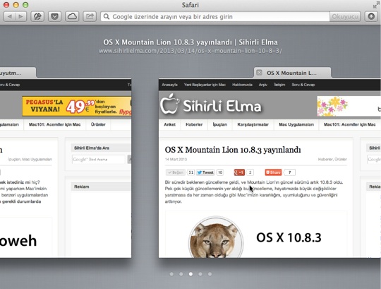 Bu da Safari 6 ile birlikte hayatımıza giren özelliklerden bir tanesi. Safari’de birden fazla sekme açık olduğunda, açık olan sekmeler arasında hızlıca dolaşmak ve istediğimiz sekmeye göz atmak için 2 parmağımızı İzleme Dörtgeni üzerinde kıstırıyor, küçük bir çimdikleme yapıyoruz.