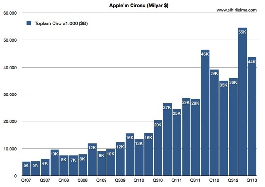 Apple 2012’nin aynı çeyreği Apple için oldukça iyi geçmiş ve net karını 13 milyar dolar seviyesine çıkartarak çıtayı aşılması zor bir seviyeye çıkartmıştı. Buna rağmen bir artış olması iyi bir işaret olsa da, elbette beklentiler çok daha yüksek. Bu yüzden Apple’ın büyümesi önceki dönemlere göre düşük kalıyor.