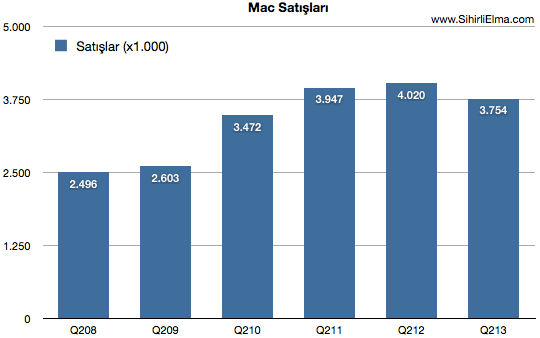 Çeyrek sonuçlarına baktığımızda da bu beklentinin etkilerini görebiliyoruz. Geçtiğimiz seneye göre %7 düşüş gösteren Mac satışlarını, çeyrek sonunda satışa sunulan yeni MacBook Air’ler bile kurtaramadı diyebiliriz. Bu düşüşe rağmen bu çeyrekte 3.8 milyon Mac satılmış.